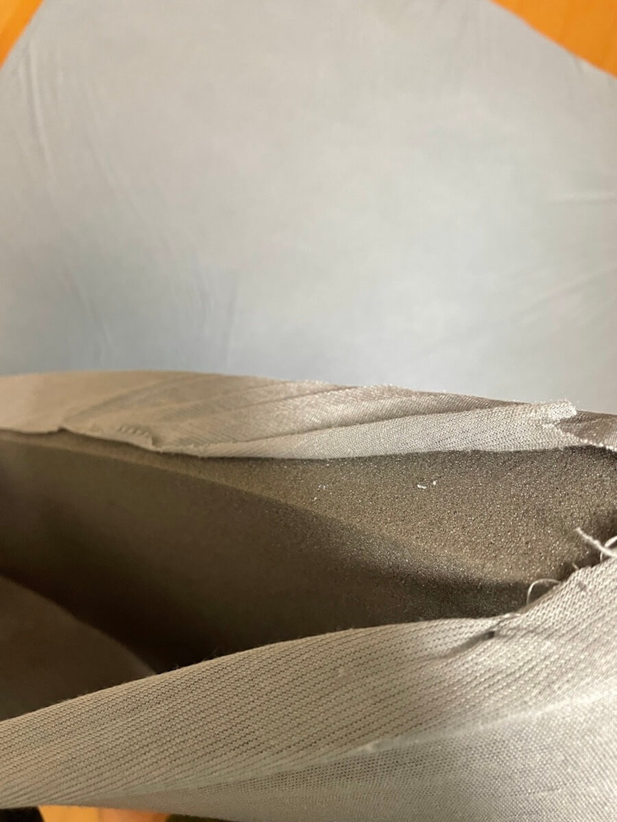 大きな布切りバサミでも、厚さ5cmのマットはそう上手く切れません。ある程度まっすぐにカットできていれば十分です。